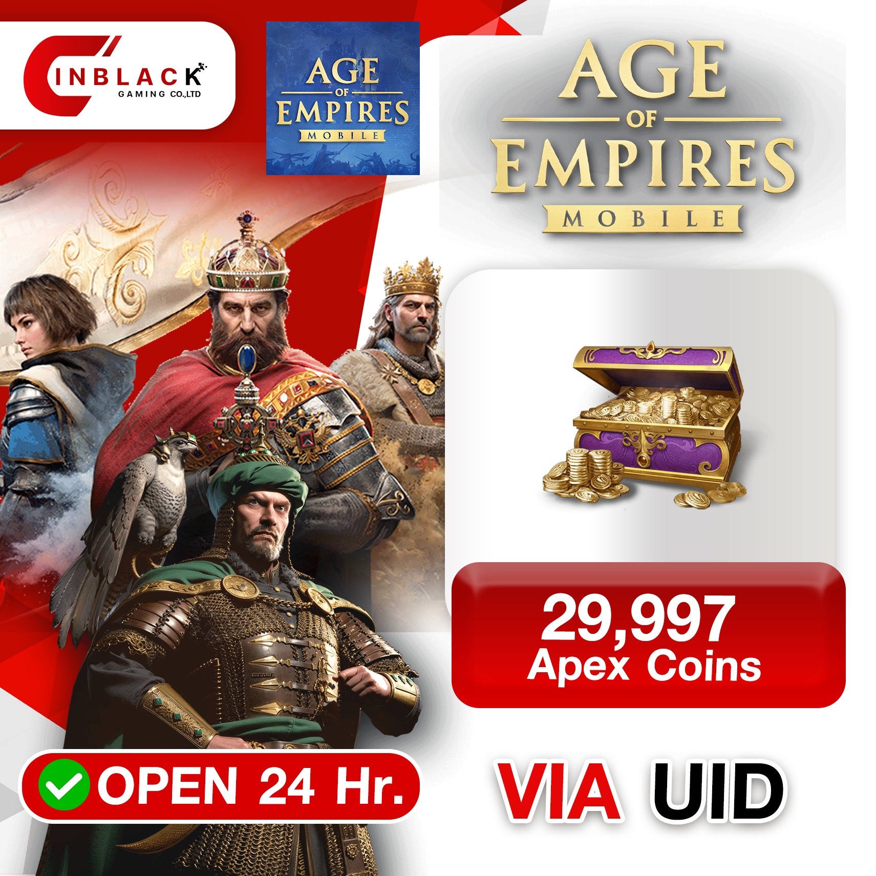Age of Empires Mobile (GL) - 29997 Apex Coins 99.99$x3 Top up UID By Inblack Open 24 hr.