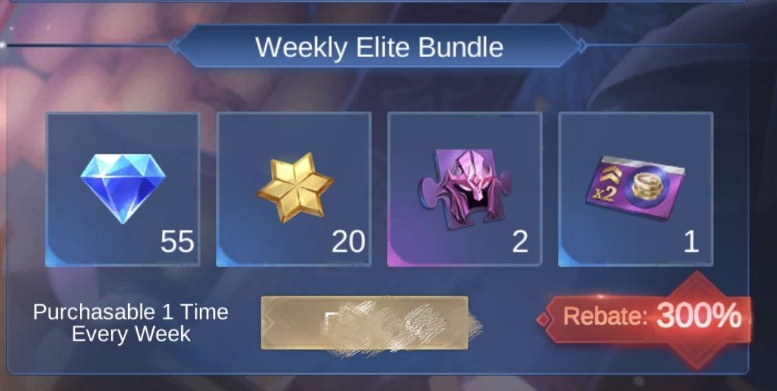 Limited Weekly Elite Bundle will give you 55 Diamonds and receive 20 Crystal Aurora , 2 Rare Skin Fragments, and 1 Win Battle Point Card