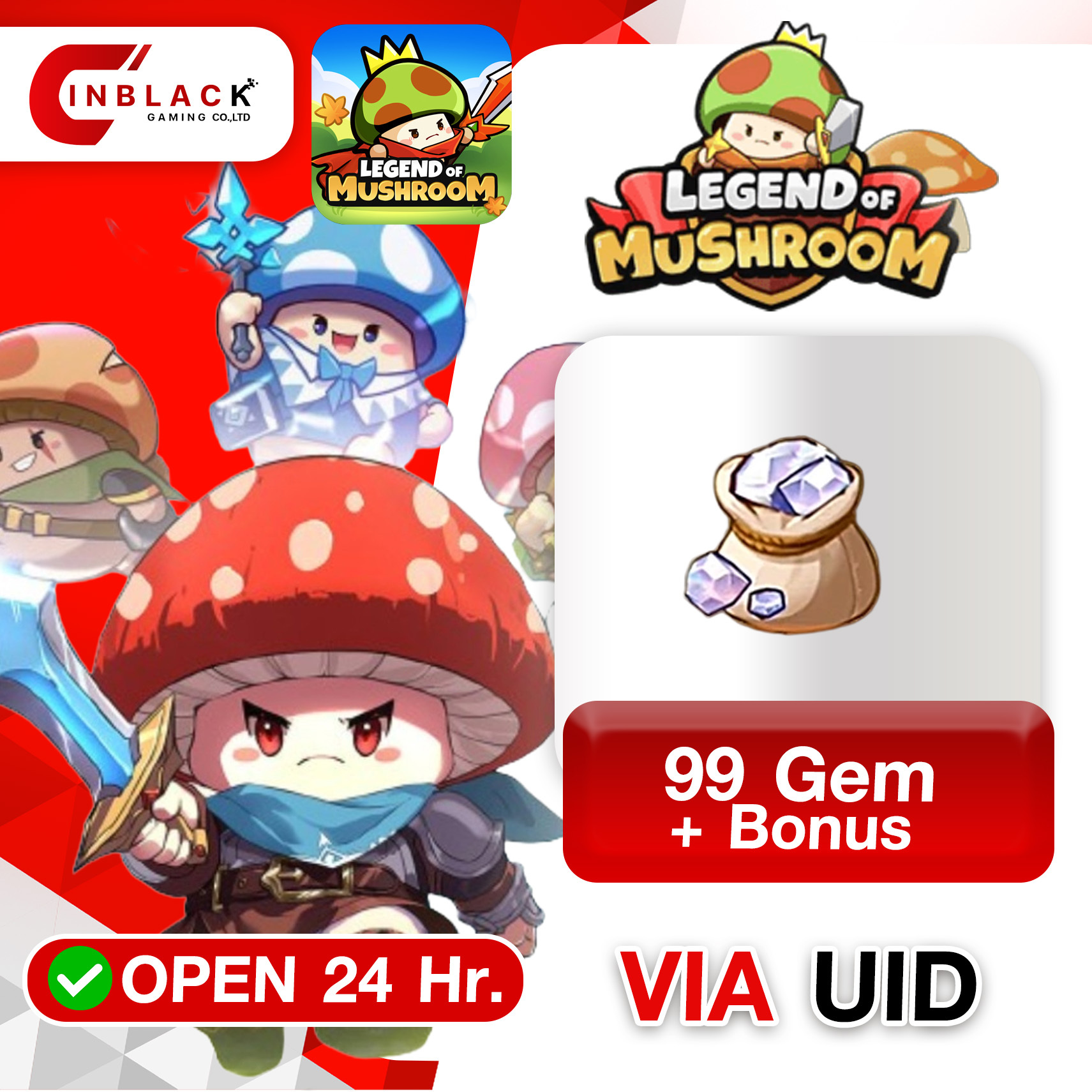 Legend of Mushroom : SEA 99 Gem + Bonus Items 0.99$ Top up UID by Inblackm open 24 hr.