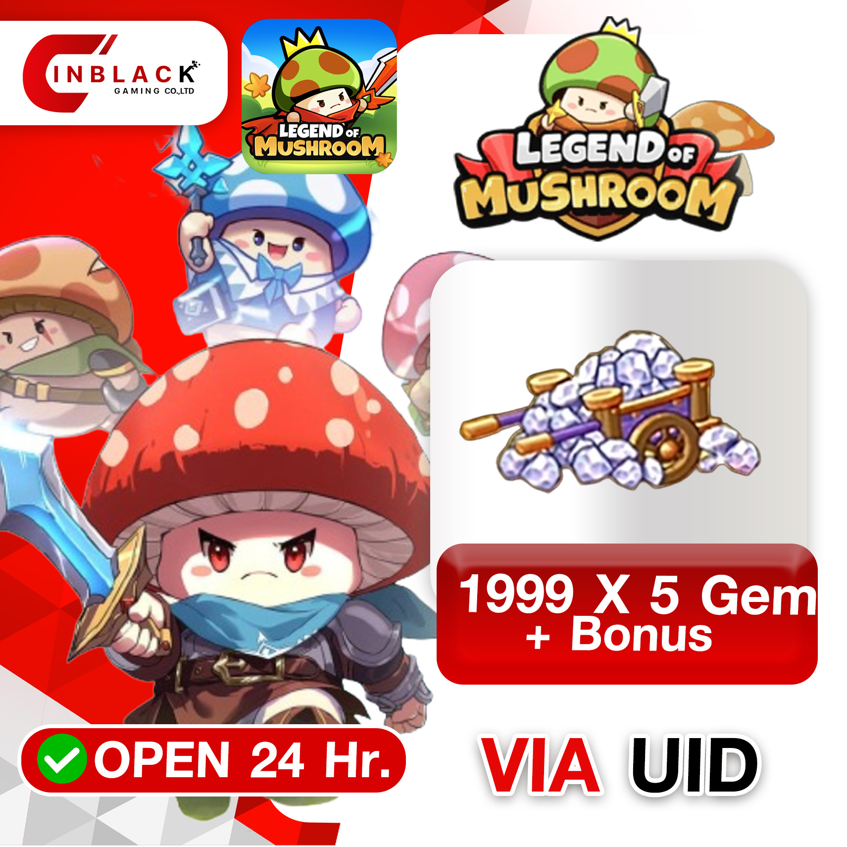 Legend of Mushroom : SEA 1999 X 5 Gem + Bonus Items 99.99$ Top up UID by Inblackm open 24 hr.
