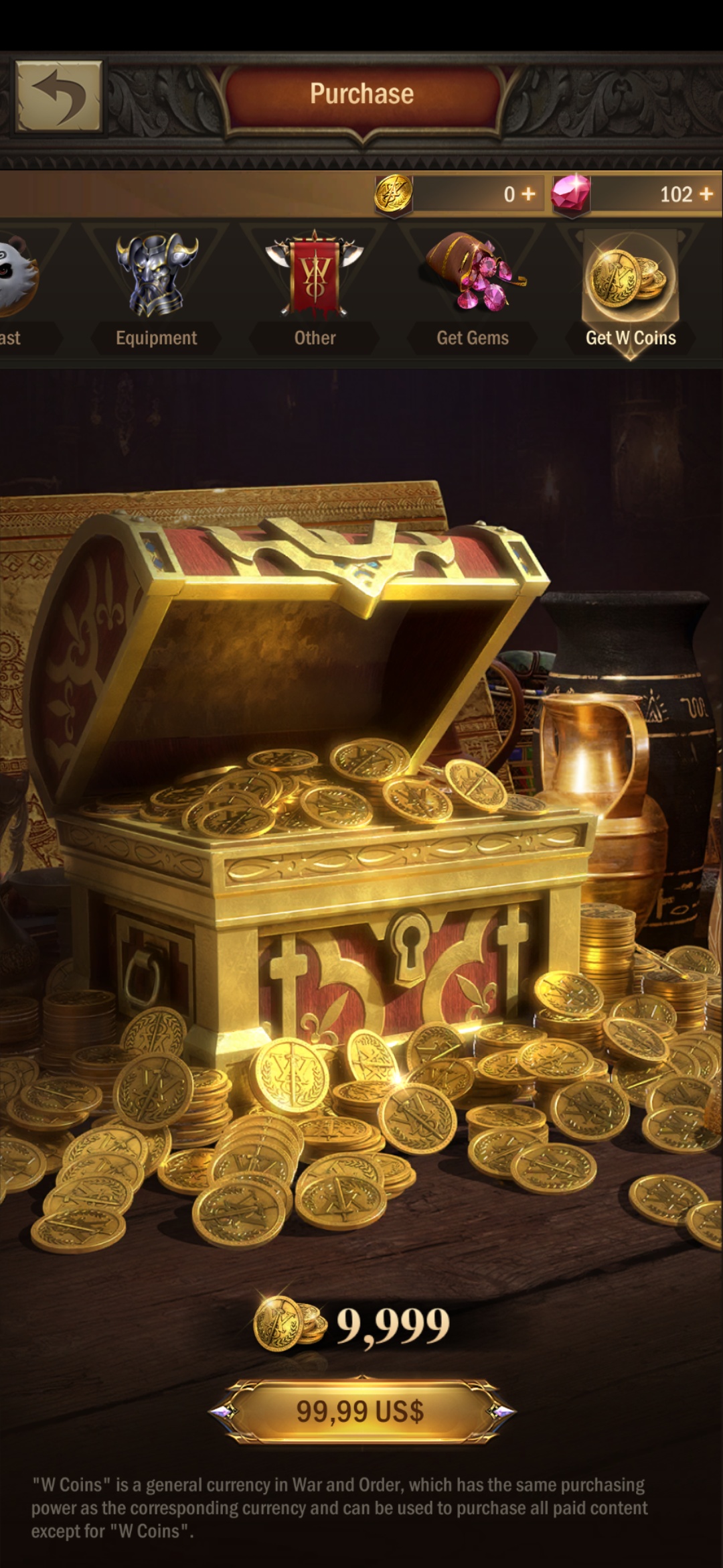 War and Order - 9999 W Coins or any packages 99.99$ - Need login